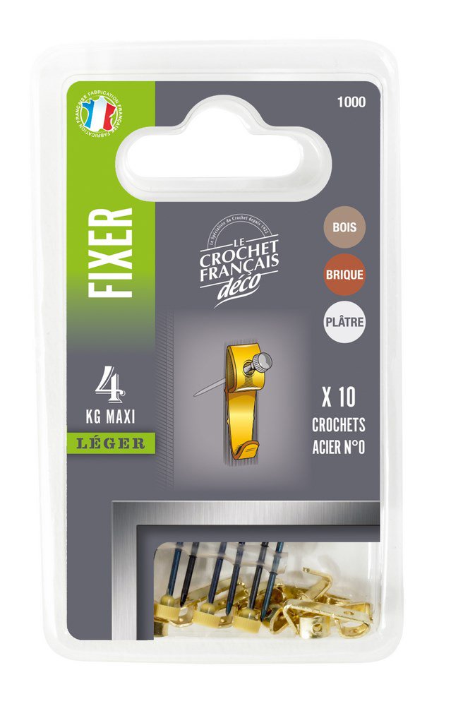 Les crochets en acier laitonné conviennent au bois, plâtre, béton cellulaire et briques creuses.