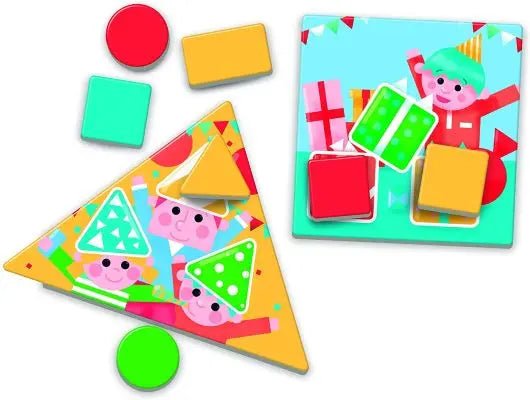 Le jeu contient 4 planches et 16 pièces colorées. Chaque pièce invite l’enfant à manipuler et expérimenter. Ensuite, le jeu propose trois modes différents :