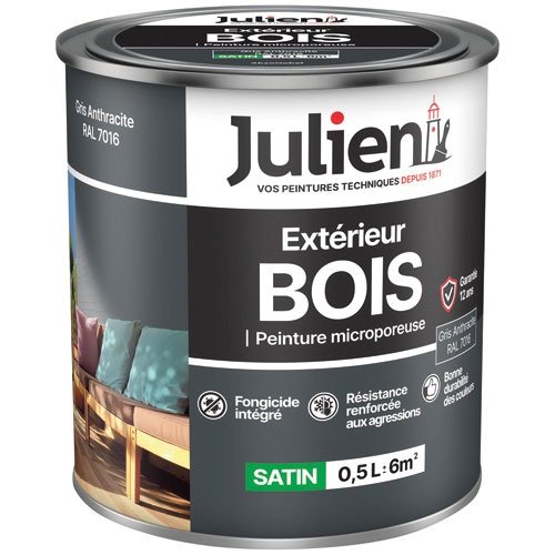 Protégez vos bois extérieurs grâce à JULIEN Peinture microporeuse satin – extérieur bois – 0.5 L – gris anthracite RAL7016. Elle résiste aux intempéries et aux rayons UV. De plus, son fongicide intégré empêche l’apparition de moisissures. Ainsi, vos surfaces restent saines et esthétiques pendant longtemps.