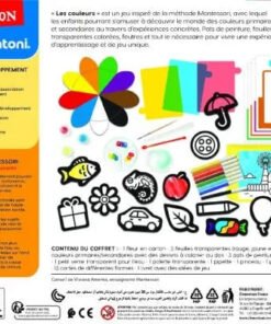 Ensuite, chaque activité du coffret est conçue pour évoluer avec les compétences de l’enfant. Tout d’abord, un jeu interactif avec une grande fleur en carton introduit les couleurs primaires et secondaires à travers un système d’appariement intuitif. Puis, lorsque l’enfant est à l’aise, il peut explorer des activités plus complexes, comme la superposition de feuilles transparentes pour observer les nuances ou la création de ses propres œuvres colorées avec les feutres et la peinture. De plus, les noms des couleurs sont progressivement introduits, favorisant un apprentissage naturel et sans pression.